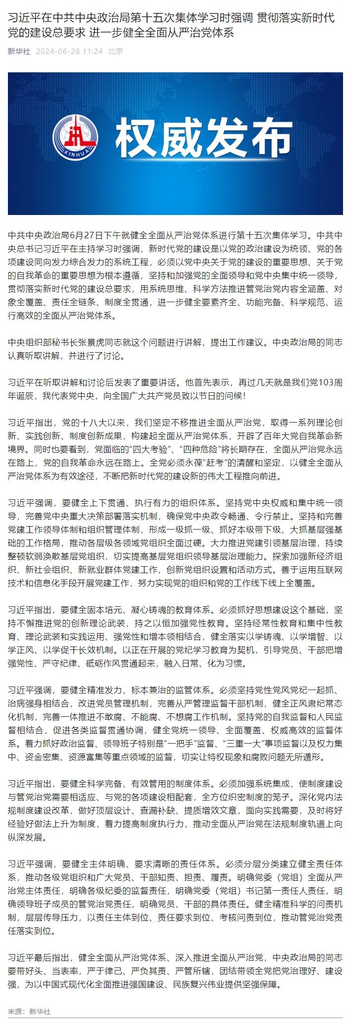 習(xí)近平在中共中央政治局第十五次集體學(xué)習(xí)時(shí)強(qiáng)調(diào) 貫徹落實(shí)新時(shí)代黨的建設(shè)總要求 進(jìn)一步健全全面從嚴(yán)治黨體系