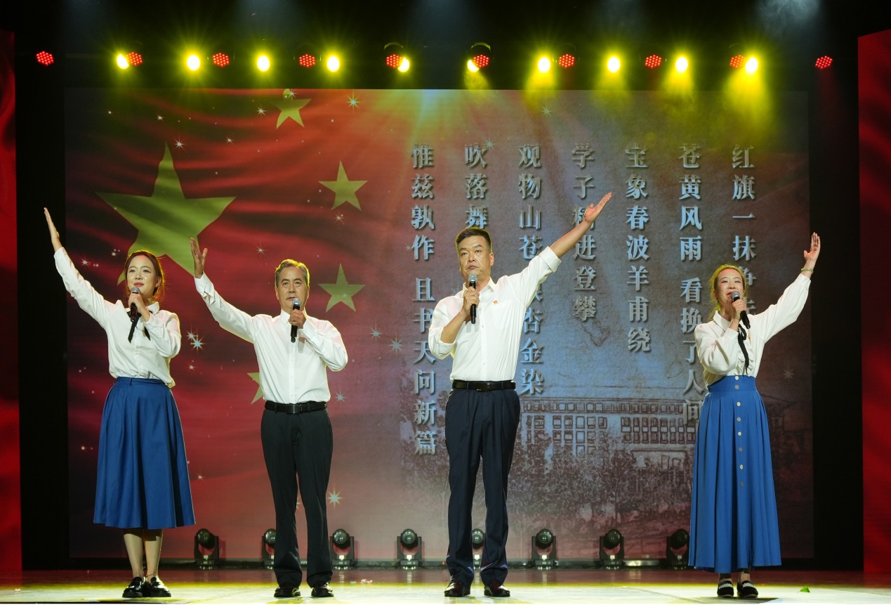 《梯田夜話》《咪啋相約來趕街》《曼恩時(shí)光》等獲獎(jiǎng)歌曲展演,展現(xiàn)近年來本科教育成果。人文學(xué)院詩(shī)朗誦《念奴嬌 紅旗頌并序》,書寫了滇池湖畔春城昆明孕育的我校百年校史,百年榮光。