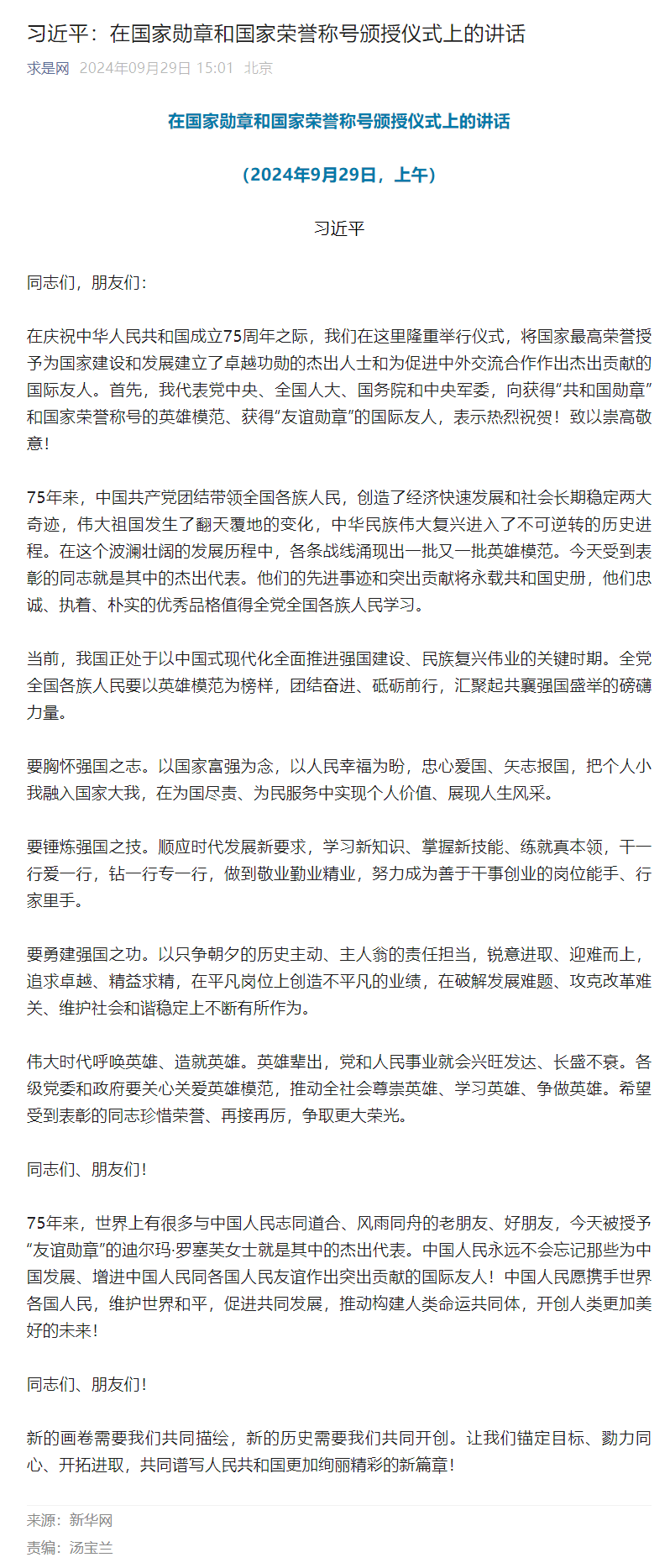 習(xí)近平:在國(guó)家勛章和國(guó)家榮譽(yù)稱號(hào)頒授儀式上的講話