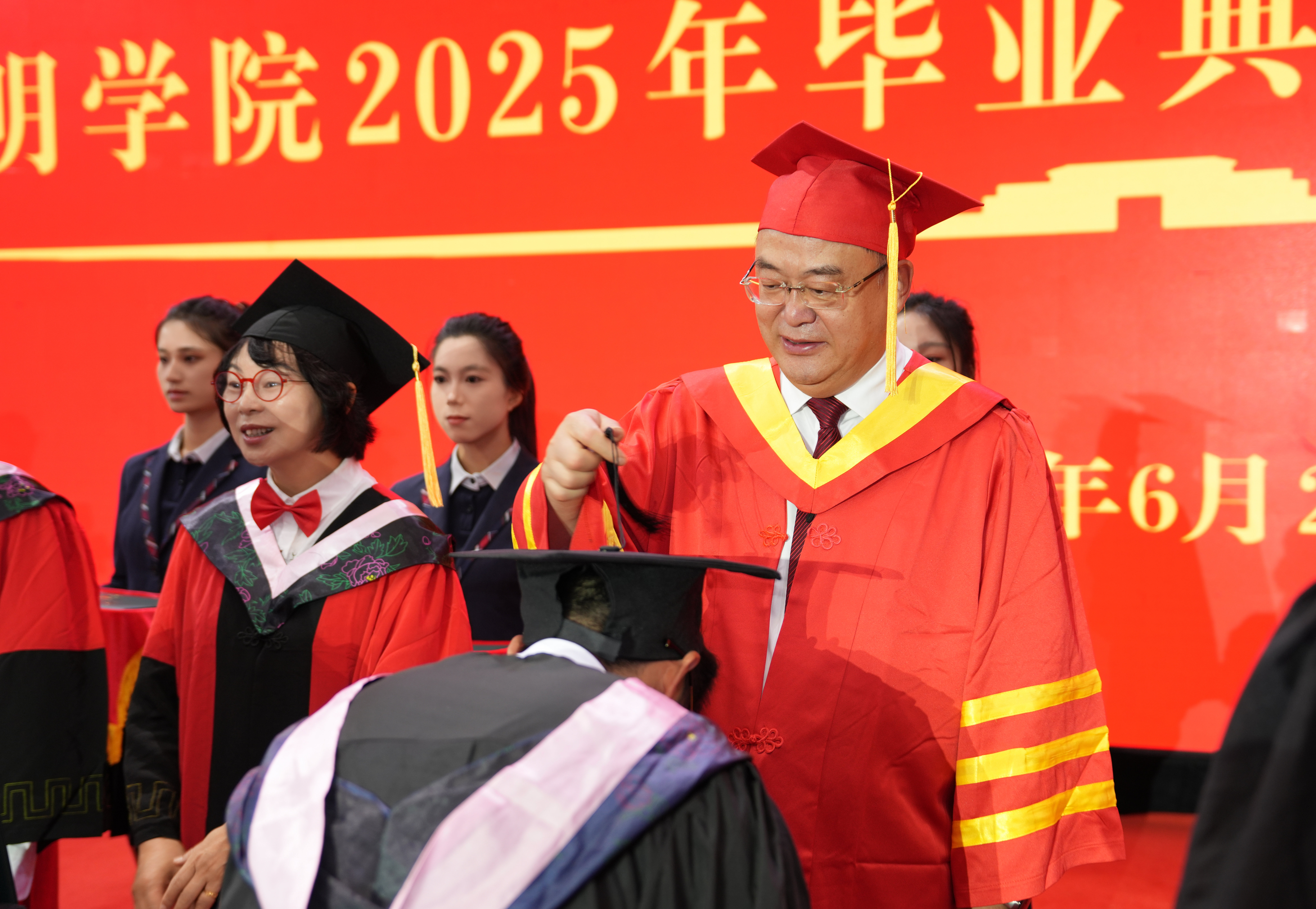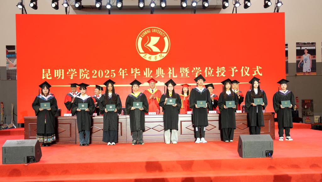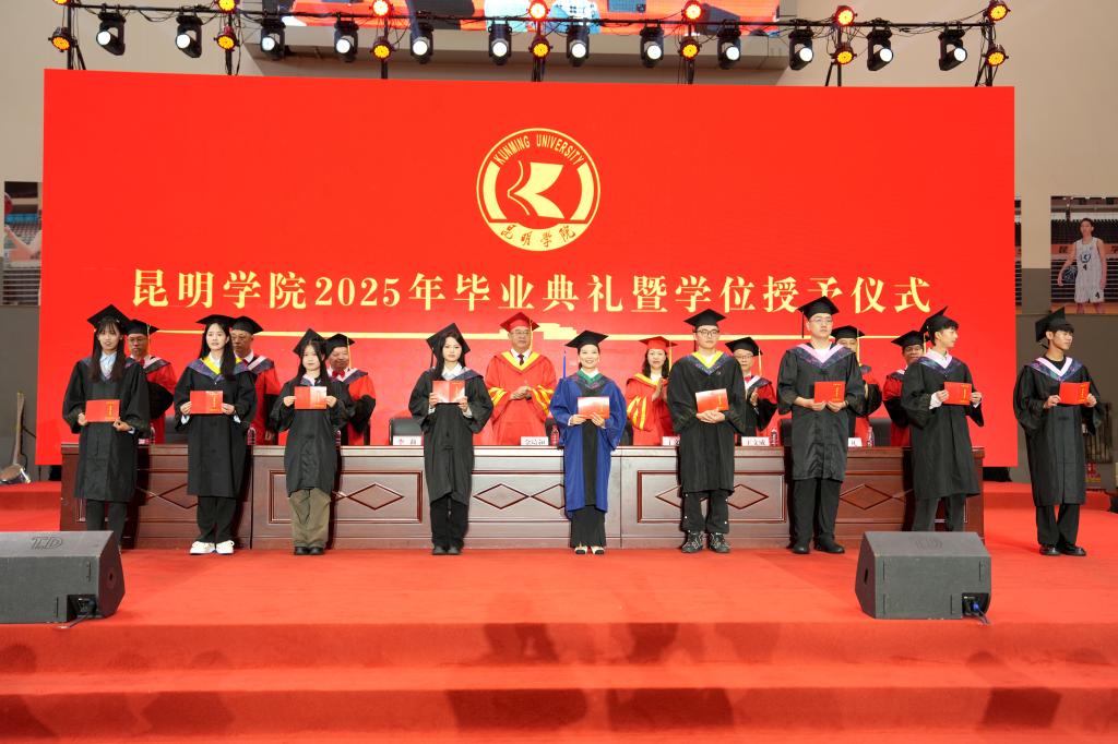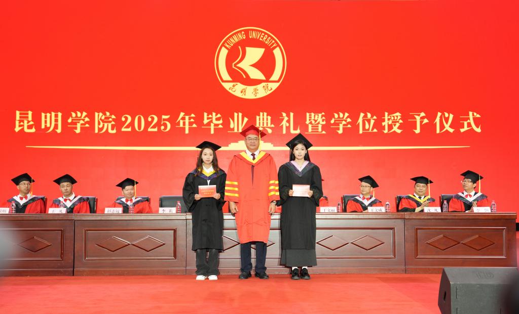 王凡宣讀2025屆昆明學(xué)院全日制碩士畢業(yè)生、本科畢業(yè)生畢業(yè)資格和學(xué)位授予決定。全體校領(lǐng)導(dǎo)為碩士畢業(yè)生、本科畢業(yè)生代表頒發(fā)畢業(yè)證書、行撥穗禮并授予學(xué)位證書。