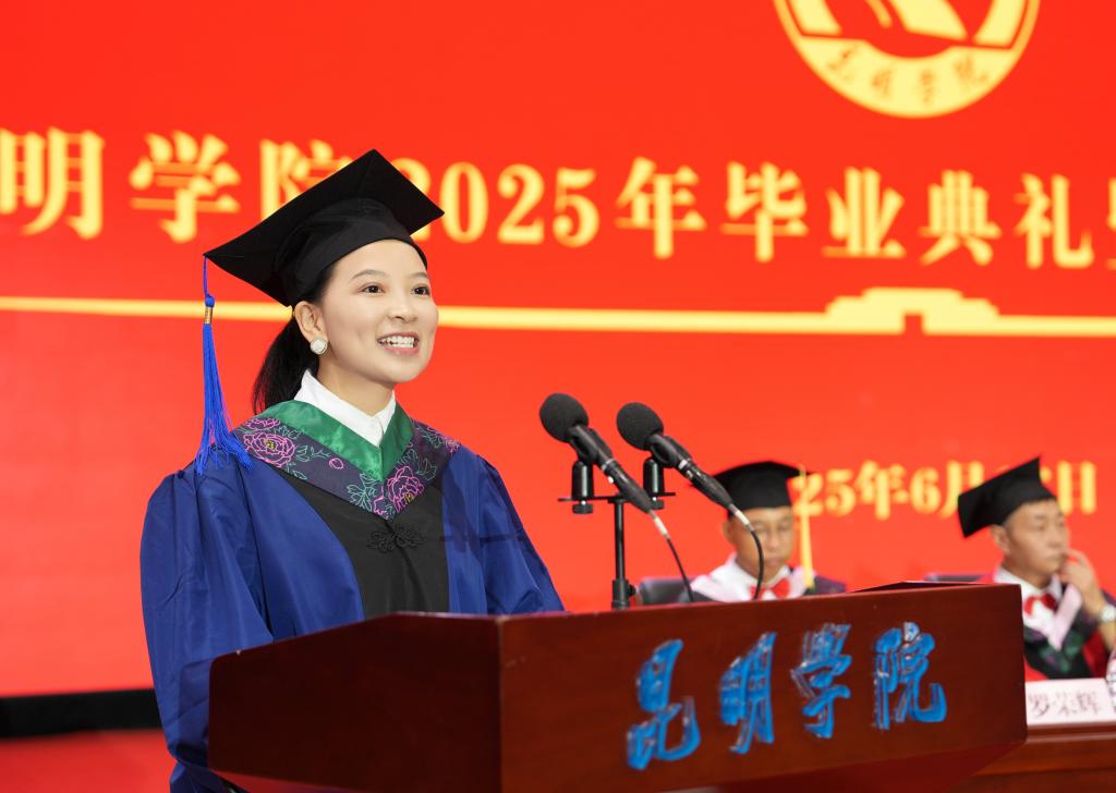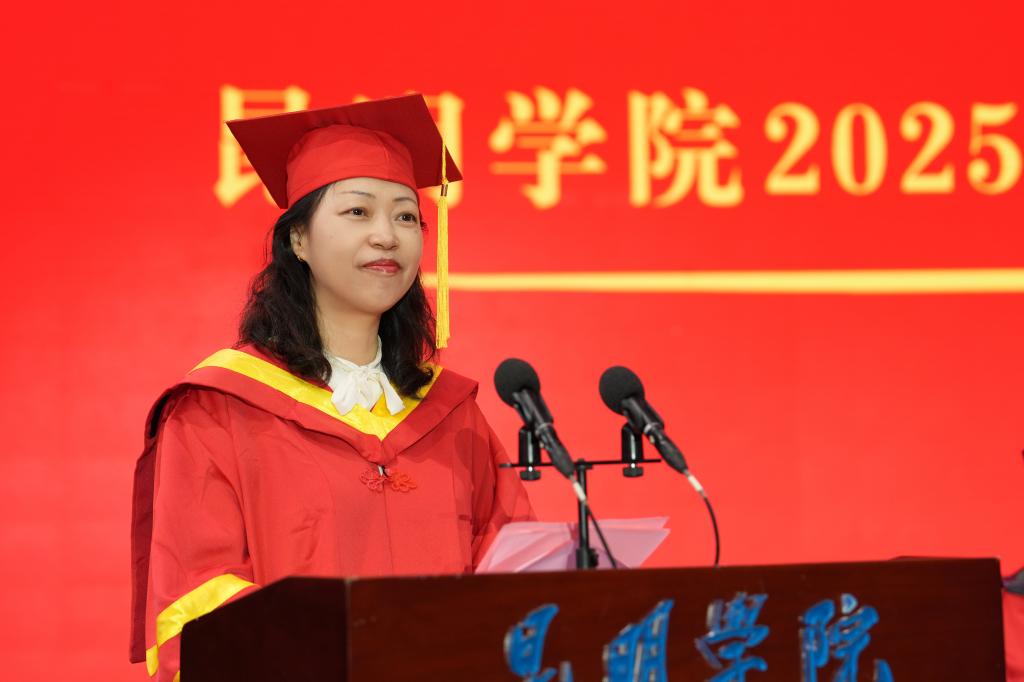 儀式上,丁文麗致詞,代表學(xué)校向2025屆順利完成學(xué)業(yè)、邁向新征程的畢業(yè)生們表示熱烈祝賀,向?yàn)橥瑢W(xué)們成長(zhǎng)成才付出心血和汗水的老師們致以崇高的敬意和衷心的感謝。她表示,四年前,同學(xué)們帶著對(duì)知識(shí)的渴望和對(duì)未來(lái)的憧憬踏入了昆明學(xué)院的校門,時(shí)間將懵懂少年雕琢成了自信從容的青年才俊,大家經(jīng)歷了學(xué)業(yè)的挑戰(zhàn),收獲了友情的溫暖,體驗(yàn)了自身的成長(zhǎng)與蝶變,用行動(dòng)詮釋了對(duì)真理的敬畏,對(duì)自我的超越,綻放了青春最美的模樣,這都將鐫刻在你們青春的記憶之中,成為母校賦予你們最深沉的底色和最持久的正能量。