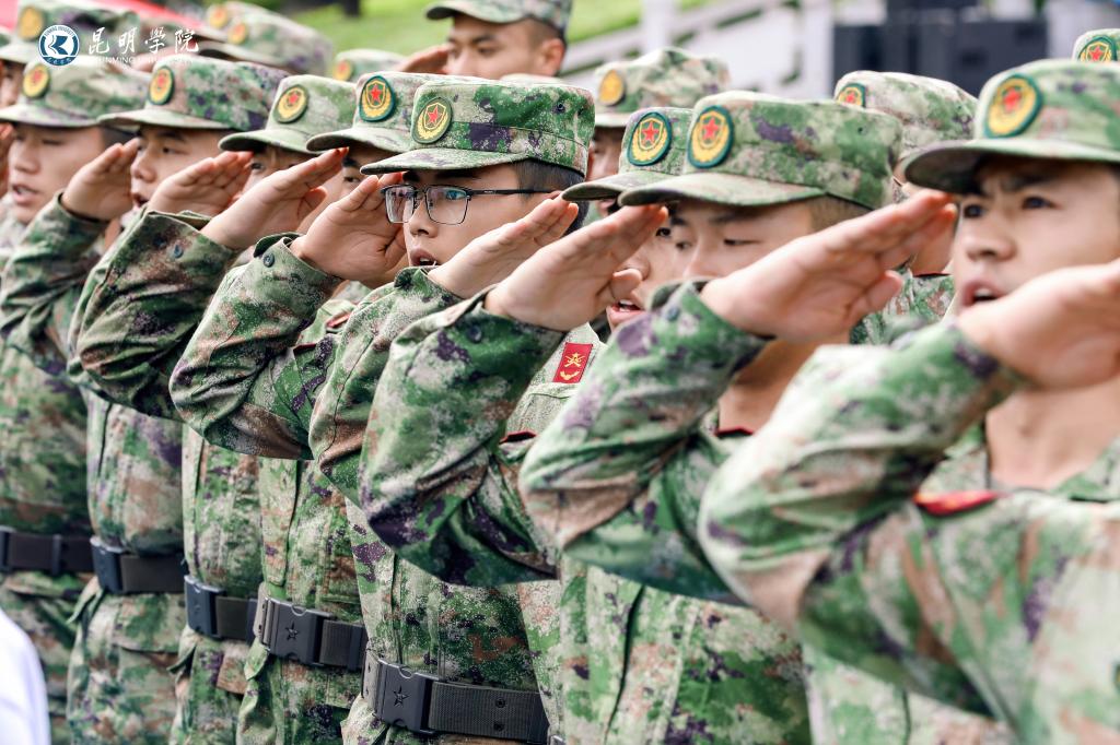 金幼和為昆明學院2025級新生軍訓團授旗,軍訓團團長接旗。