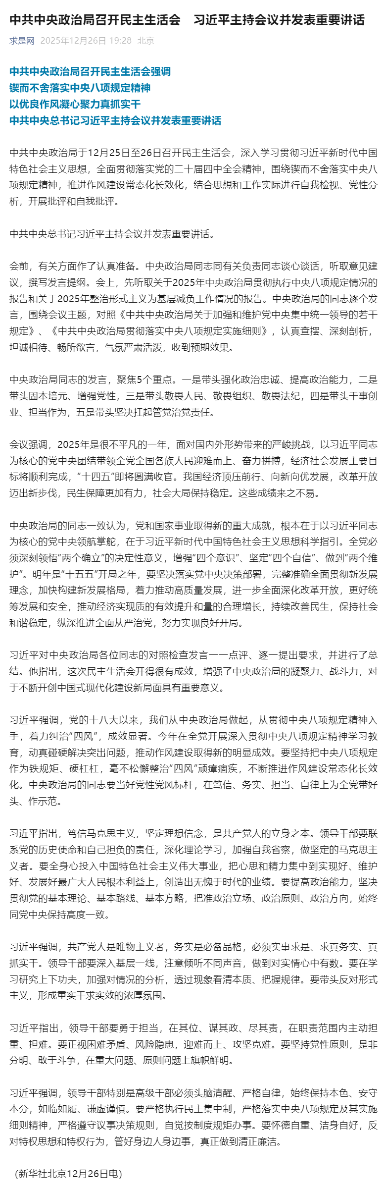 中共中央政治局召開民主生活會(huì) 習(xí)近平主持會(huì)議并發(fā)表重要講話