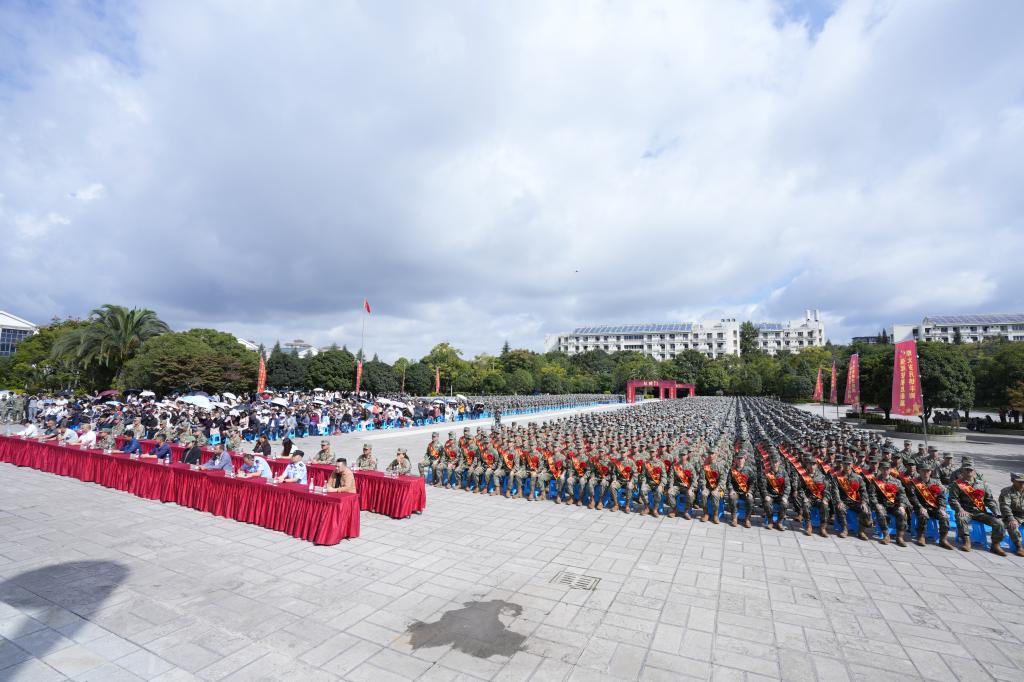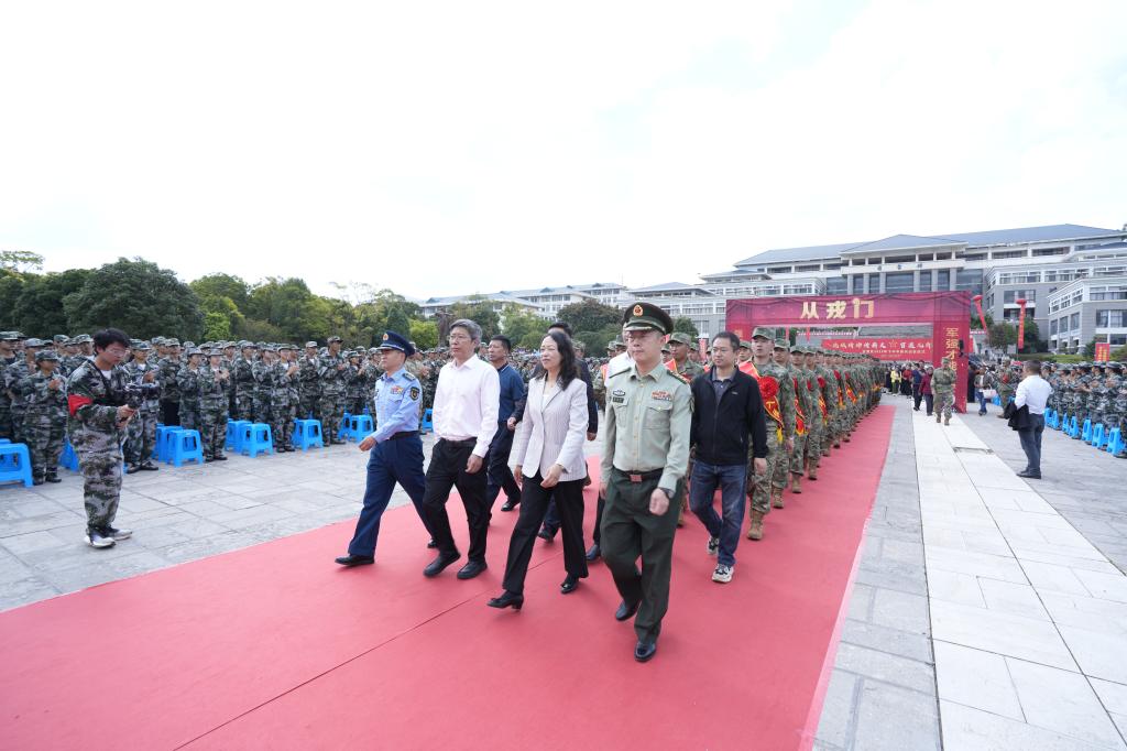 學校黨委副書記、校長丁文麗出席儀式,區(qū)人武部上校政委王濤主持。轄區(qū)6所高校、滇中新區(qū)、經開區(qū)武裝部負責人、12個街道負責人,接兵部隊代表,新兵家長,軍訓新生4000余人參加了新兵出征儀式。
