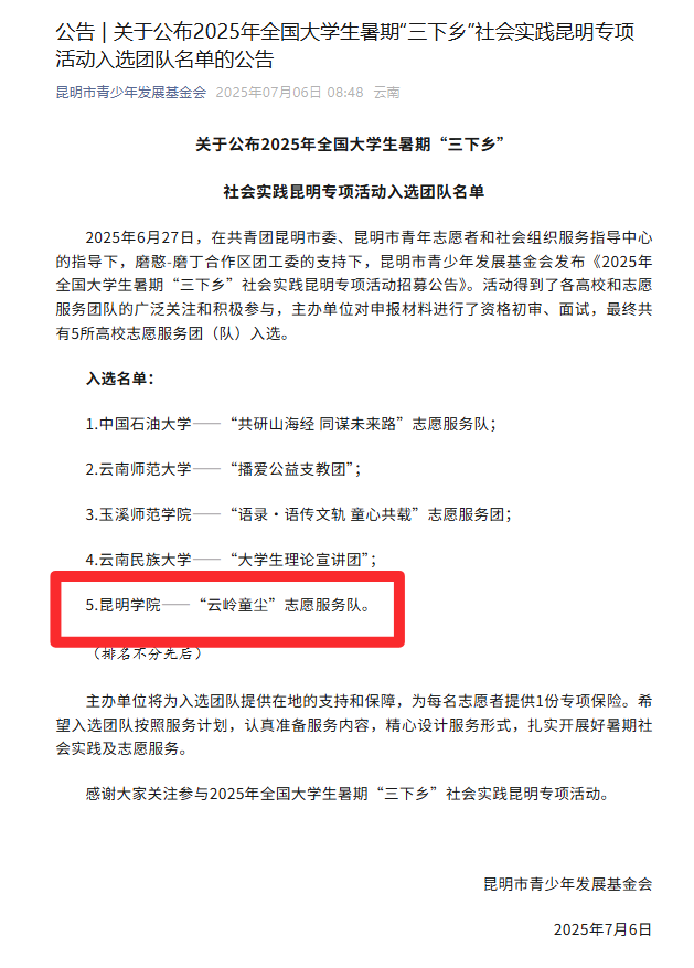 今年暑期,昆明學(xué)院團委在學(xué)校黨委的領(lǐng)導(dǎo)和團省委的悉心指導(dǎo)下,組建了146支暑期“三下鄉(xiāng)”社會實踐團隊,選派156名指導(dǎo)教師,帶領(lǐng)3808名青年學(xué)生分赴云南、安徽、山東等44個縣市基層一線,緊扣“青春為中國式現(xiàn)代化挺膺擔(dān)當(dāng)”主題,廣泛開展了內(nèi)容豐富、形式多樣的社會實踐活動,將愛國情、強國志、報國行自覺融入新時代追夢征程,展現(xiàn)青年擔(dān)當(dāng)。