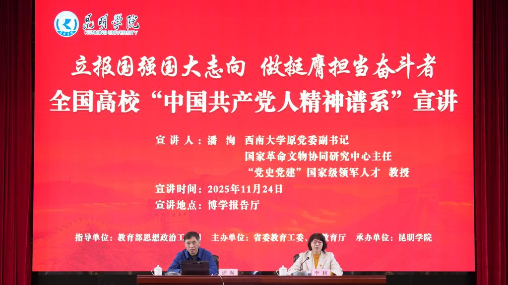 11月24日,全國高校“中國共產(chǎn)黨人精神譜系”云南省巡回宣講走進昆明學院,舉辦“張桂梅思政大講堂—昆明學院分課堂”第6講暨“青年?銳講壇”第157講,深入學習黨的二十屆四中全會精神。