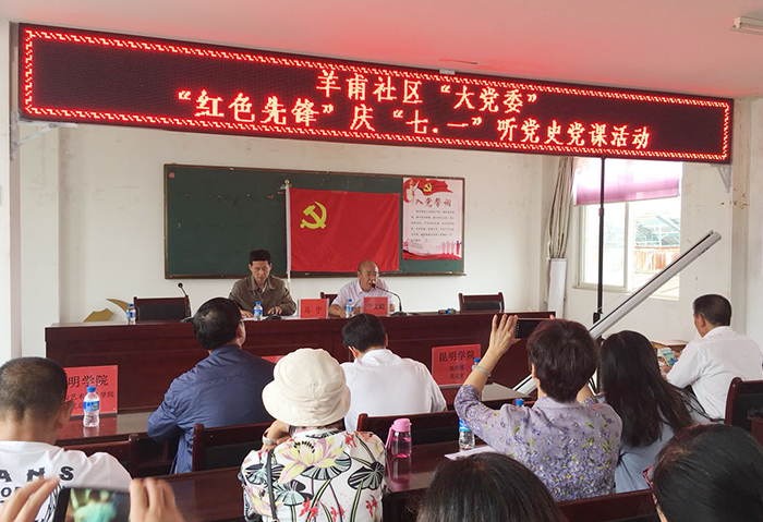 7月5日,馬克思主義學院直屬黨支部書記李剴、院長董學榮一行參加羊甫社區(qū)“大黨委”“紅色先鋒”慶“七一”聽黨課活動。羊甫社區(qū)黨總支書記李文德主持活動,并帶領(lǐng)全體參會人員重溫入黨誓詞, 馬克思主義學院教授馬寧老師主講,作“艱難困苦,玉汝于成——學習黨史牢記使命”主題宣講。馬教授用生動、感人、鮮活的歷史人物和事例,深情講述了中國共產(chǎn)黨形成的時代背景,中國共產(chǎn)黨成立的思想文化條件和理論淵源,“南陳北李”相約建黨的歷史進程,及建黨后的“兩次勝利、兩次失敗”的艱難探索,馬克思主義中國化的歷史性飛躍及學習黨史、不忘初心、牢記使命等內(nèi)容。講述深入淺出、通俗易懂,謳歌了共產(chǎn)黨人為了革命事業(yè),堅定崇高理想信念,浴血奮戰(zhàn)、不怕犧牲的高尚品質(zhì)。使參會人員了解了中國共產(chǎn)黨97年的奮斗歷程,重溫黨史、銘記黨恩。 社區(qū)黨總支書記李文德表示,本次黨課是一次寓意深刻的高規(guī)格高質(zhì)量教育課,使人受益匪淺,昆明學院對社區(qū)建設(shè)給予了全力支持,社區(qū)會充分運用好與學校合作的資源優(yōu)勢,促進合作,促進社區(qū)和學校的發(fā)展。