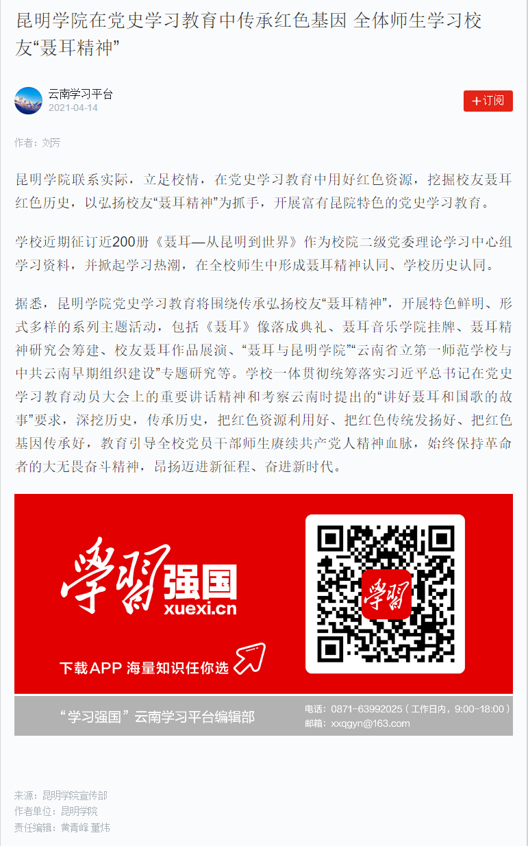 昆明學院在黨史學習教育中傳承紅色基因 全體師生學習校友“聶耳精神”