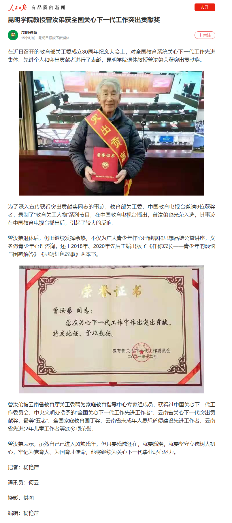 昆明學(xué)院教授曾汝弟獲全國(guó)關(guān)心下一代工作突出貢獻(xiàn)獎(jiǎng)