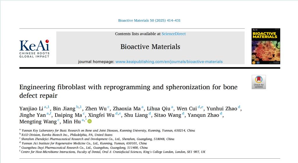 近日,昆明學(xué)院云南省骨與關(guān)節(jié)疾病基礎(chǔ)研究重點實驗室在國際知名期刊《Bioactive Materials》(中國科學(xué)院1區(qū)TOP期刊,影響因子:18.0)上發(fā)表題為“Engineering fibroblast with reprogramming and spheronization for bone defect repair”的研究論文,引發(fā)學(xué)界關(guān)注。