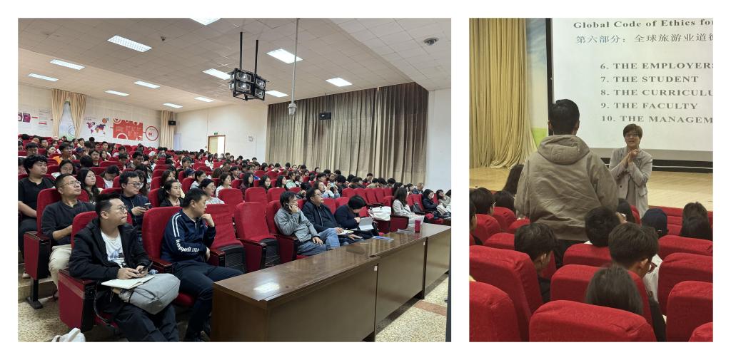 講座伊始,謝慧孜副主任深入淺出介紹了《全球旅游倫理規(guī)范》的背景、意義、核心內(nèi)容。她指出,隨著全球旅游業(yè)的快速發(fā)展,旅游倫理問題愈發(fā)凸顯,《全球旅游倫理規(guī)范》的制定,正是為了引導旅游從業(yè)者和游客樹立正確的價值觀,推動旅游業(yè)可持續(xù)發(fā)展。謝慧孜通過豐富的案例,生動的講解,讓在場師生對旅游倫理重要性有了深刻的理解,她分享了寧波大學熱昂大學聯(lián)合學院在踐行《全球旅游倫理規(guī)范》過程中的實踐經(jīng)驗,談到:學院通過創(chuàng)新課程設(shè)置、開展實踐活動、與旅游企業(yè)深度合作,將旅游倫理理念融入到教學與實踐各個環(huán)節(jié)。這些舉措,不僅提升了學生的專業(yè)素養(yǎng),也為旅游行業(yè)的可持續(xù)發(fā)展培養(yǎng)具有責任感的高素質(zhì)人才。