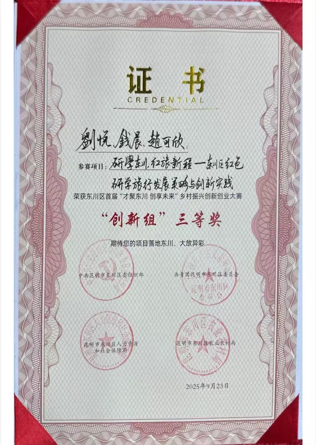 本次大賽共有500余名創(chuàng)新創(chuàng)業(yè)人員參與,169個涵蓋特色農(nóng)業(yè)、文旅融合、智慧鄉(xiāng)村等領(lǐng)域的項目進行比拼。我校青年學(xué)子劉悅、錢晨、趙可欣團隊的“研學(xué)東川,紅旅新程——東川區(qū)紅色研學(xué)旅行發(fā)展策略與創(chuàng)新實踐”創(chuàng)新項目脫穎而出,榮獲大賽創(chuàng)新組三等獎,并現(xiàn)場與云南博軒文旅簽署項目落地意向協(xié)議書,享受東川區(qū)相關(guān)產(chǎn)業(yè)扶持政策及大賽提供的28項支持政策,初步實現(xiàn)了“挑戰(zhàn)杯”大學(xué)生課外學(xué)術(shù)科技作品競賽成果的落地轉(zhuǎn)化。