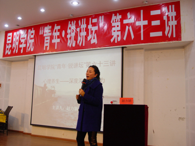 10月24日晚,由校團(tuán)委主辦的“青年•銳講壇”第六十三講“心理養(yǎng)生——深度溝通的魅力”在青年中心學(xué)生報(bào)告廳成功舉辦。本場(chǎng)講座邀請(qǐng)到了云南省演講學(xué)會(huì)常務(wù)理事、國(guó)家二級(jí)企業(yè)培訓(xùn)師、國(guó)家二級(jí)心理咨詢師、AA級(jí)沙盤治療師、國(guó)際注冊(cè)催眠師趙力穎老師擔(dān)任主講人。