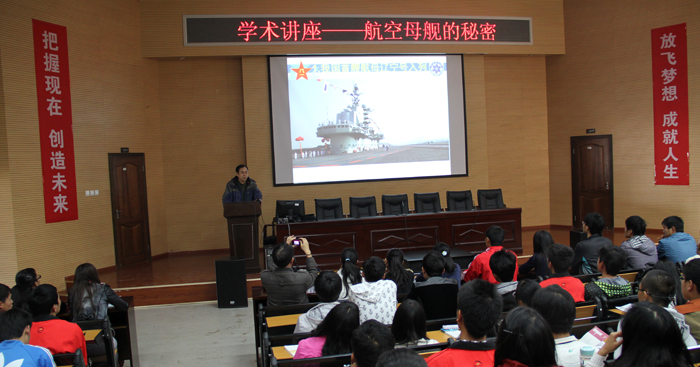 講座從我國第一艘航空母艦“遼寧號”說起,介紹了其建造、試驗及服役的整個過程。接著以航空母艦四宗“最”,即最具爭議的武器、保鏢最多的武器、最昂貴的武器、最難駕馭的武器四個方面為切入點向同學們解析了航空母艦從誕生到現(xiàn)在的發(fā)展歷程。同時講座還配以大量豐富而鮮見的圖片、視頻資料和詳盡的數(shù)據(jù),生動形象地向同學們展示了航空母艦的外形內構、航母的生活設施以及飛機如何在航母上起飛和降落,進一步加深同學們對航母的認識。