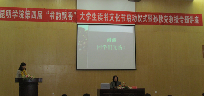 本屆讀書文化節(jié)啟動(dòng)儀式邀請(qǐng)到了云南省國(guó)學(xué)研究會(huì)理事、原人文學(xué)院教授孫秋克老師為我校大學(xué)生做專題講座。講座上,孫教授圍繞“e時(shí)代閱讀”這一主題,結(jié)合流行與經(jīng)典的書籍、如何選書、如何讀書等內(nèi)容,為同學(xué)們進(jìn)行全面深入地分析。孫教授認(rèn)為讀書應(yīng)聚精會(huì)神、由淺入深、由略到詳、由表及里地了解文學(xué)作品思想,在心中進(jìn)行再創(chuàng)作,還原視覺(jué)形象,最后達(dá)到廢寢忘食是閱讀的最高境界。最后,孫教授以 “開(kāi)卷有益,只爭(zhēng)朝夕”結(jié)束了本場(chǎng)講座。啟動(dòng)儀式最后,團(tuán)委副書記魏妮婭作總結(jié)。她對(duì)孫教授的精彩講座表示衷心感謝,她認(rèn)為讀書應(yīng)當(dāng)作為當(dāng)代大學(xué)生的一種志趣,陪伴終生。希望通過(guò)本屆讀書文化節(jié)的舉辦能激發(fā)同學(xué)們的讀書熱情,在同學(xué)中掀起愛(ài)書熱潮,營(yíng)造書韻飄香的校園氛圍。
