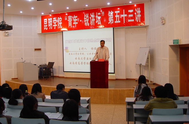 11月22日晚,由校團(tuán)委主辦的“青年•銳講壇”第五十三講——“中國法制建設(shè)中的熱點(diǎn)問題剖析”在青年中心學(xué)生報(bào)告廳成功舉辦。本場講座邀請到云南大學(xué)出版社總編輯、云南大學(xué)公共管理學(xué)院博士生導(dǎo)師、云南大學(xué)法學(xué)院碩士生導(dǎo)師楊臨宏擔(dān)任主講人。