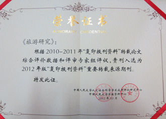 中國(guó)人民大學(xué)人文社會(huì)科學(xué)學(xué)術(shù)成果評(píng)價(jià)研究中心、中國(guó)人民大學(xué)資料中心根據(jù)2010-2011年“復(fù)印報(bào)刊資料”轉(zhuǎn)載論文綜合評(píng)價(jià)數(shù)據(jù)和評(píng)審專家組評(píng)議,將我校主辦的《旅游研究》入選為2012年版“復(fù)印報(bào)刊資料”重要轉(zhuǎn)載來(lái)源期刊。
