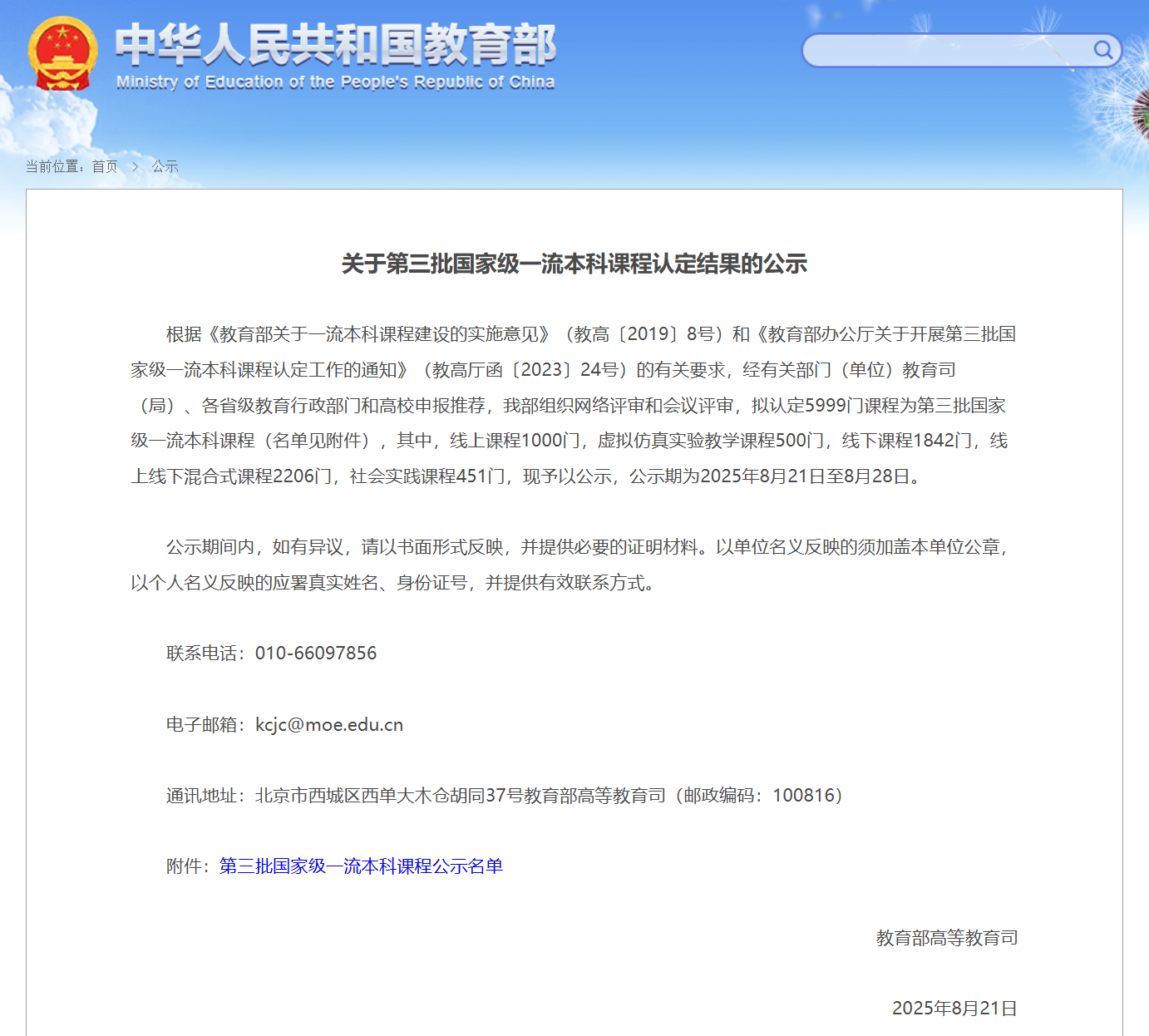 8月22日,教育部網(wǎng)站發(fā)布《關于第三批國家級一流本科課程認定結果的公示》,我校4門課程成功入選,分別為:學特學院高春玲教授《幼兒園管理》、旅游學院田芙蓉教授《餐飲運營管理》、農生學院侯秀麗教授《生態(tài)學》、人文學院孫雪瑩副教授《紀錄片與專題片研究》。這是學校首次獲批國家級一流課程,是在課程建設中取得的重大突破。