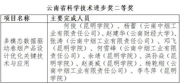 8月22日,云南省科學(xué)技術(shù)獎(jiǎng)勵(lì)大會(huì)在昆明召開。昆明學(xué)院以第一完成單位申報(bào)的“多模態(tài)數(shù)據(jù)驅(qū)動(dòng)卷煙產(chǎn)品設(shè)計(jì)優(yōu)化關(guān)鍵技術(shù)與應(yīng)用”成果榮獲2024年度云南省科學(xué)技術(shù)進(jìn)步獎(jiǎng)二等獎(jiǎng)。此外,參與項(xiàng)目獲得1項(xiàng)自然科學(xué)二等獎(jiǎng)和1項(xiàng)科學(xué)技術(shù)進(jìn)步三等獎(jiǎng)。