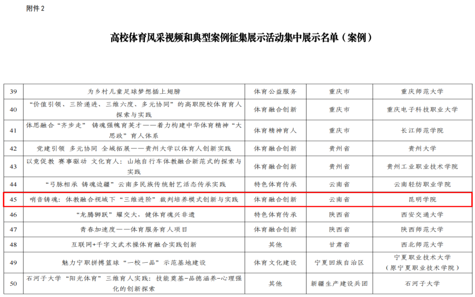 此次入選,既是對我校體育育人工作的充分肯定,也是對體育學(xué)院師生持續(xù)探索體教融合路徑的積極鼓舞。值得一提的,云南省僅有兩項案例入選全國展示,我校案例位列其中。該作品聚焦體教融合創(chuàng)新課程體系,系統(tǒng)呈現(xiàn)了我校在體育課程改革與體育精神育人方面的深入探索和階段性成果,生動展現(xiàn)了昆院師生積極向上、拼搏進(jìn)取的精神風(fēng)貌。